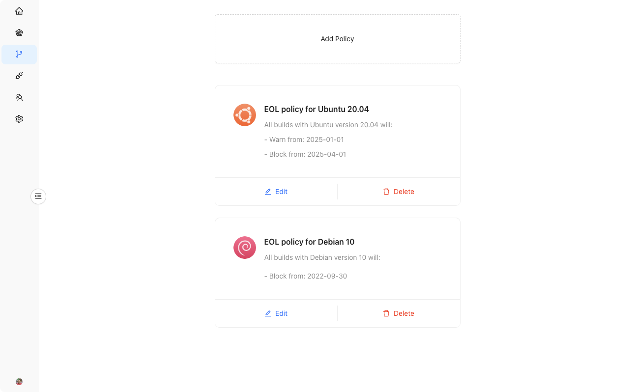 Now that you have data about your builds, you can create policies in the dashboard that are enforced at build time. You can set security policies towarn or deny on any software within your image: