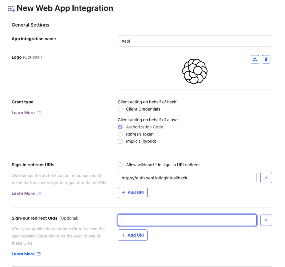 Setup the new app with the following settings Sign-in Redirect URIs:https://auth.xeol.io/login/callback